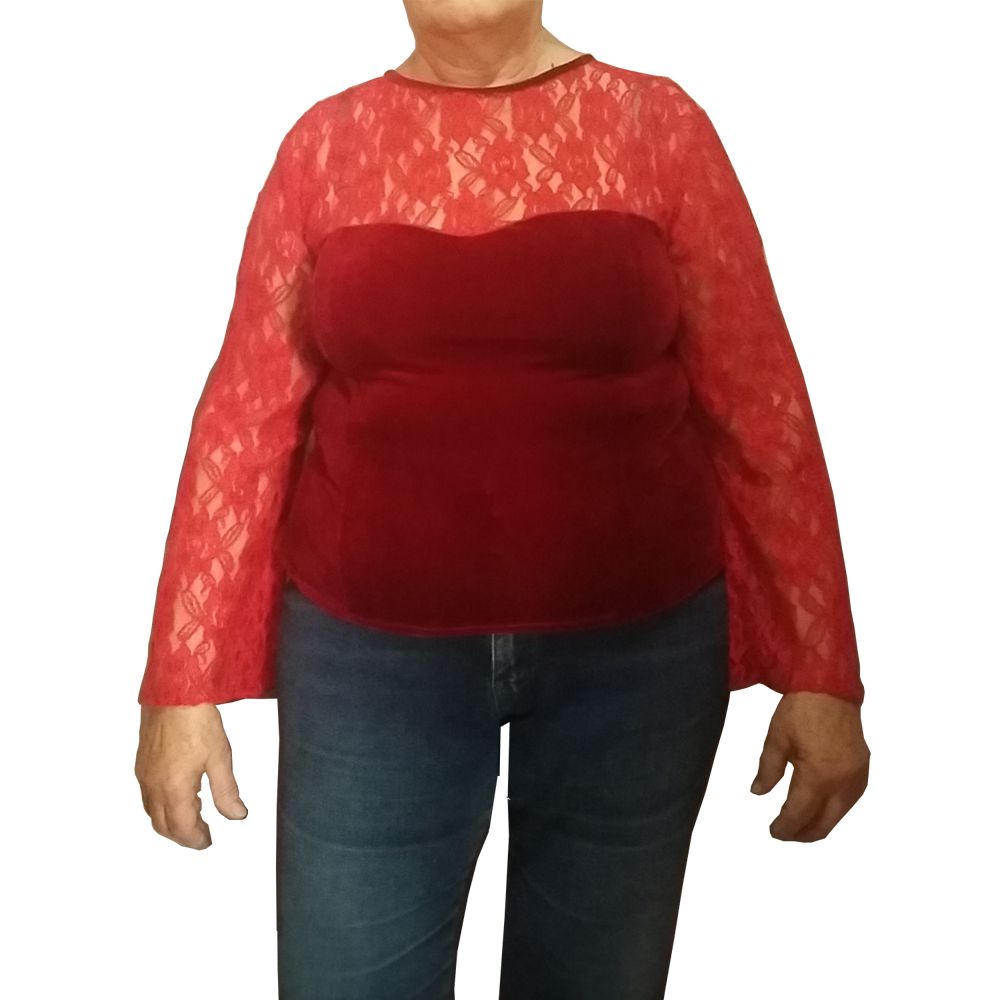 Feita de veludo Deluxe, na cor vermelha com detalhe de renda, também vermelha, com decote arredondado, imitando um corset.